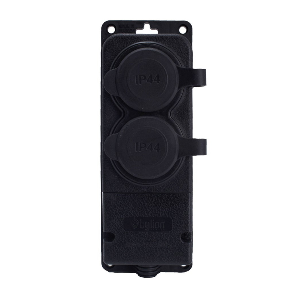 Tomada dupla hermética de "borracha" preta de alta qualidade com proteção IP44(com aba) com norma de ligação à terra SCHUKO, 16 amperes 250 volts, fabricada pela Bylion.