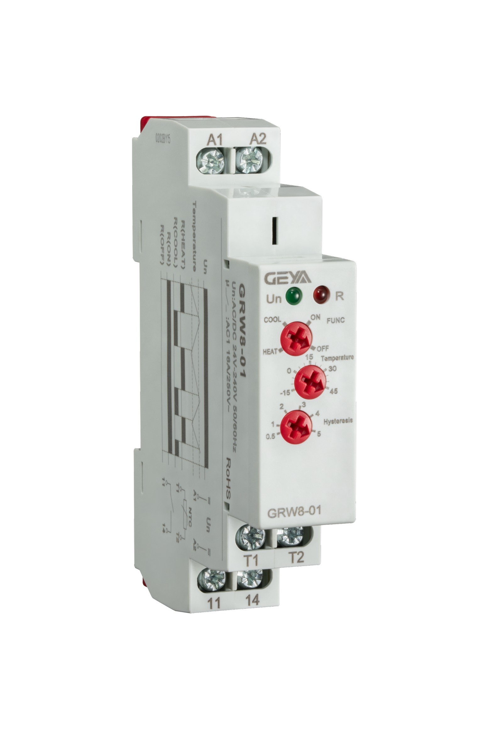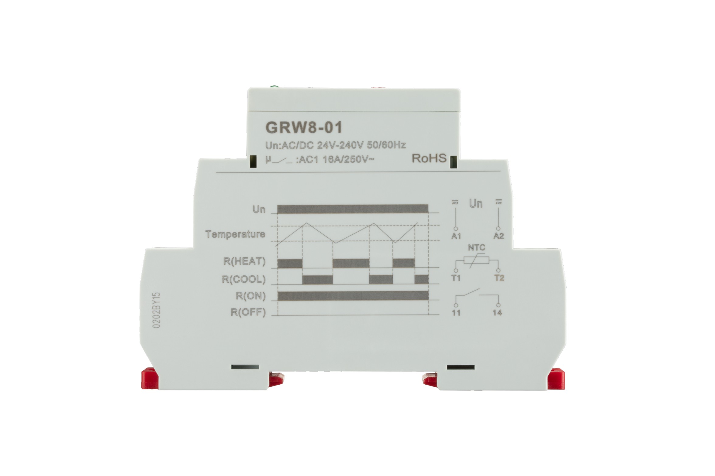 Digital Thermostat GRW8-01 AC/DC 24V-240V Temperature Control Relay Temperature Control Monitor with LN Test Probe Power Terminal DIN Rail Mounting The temperature control relay can select heating/cooling mode for high/low temperature monitoring. The operating status is indicated by LED indicator, the power indicator is green and the output relay indicator is red.