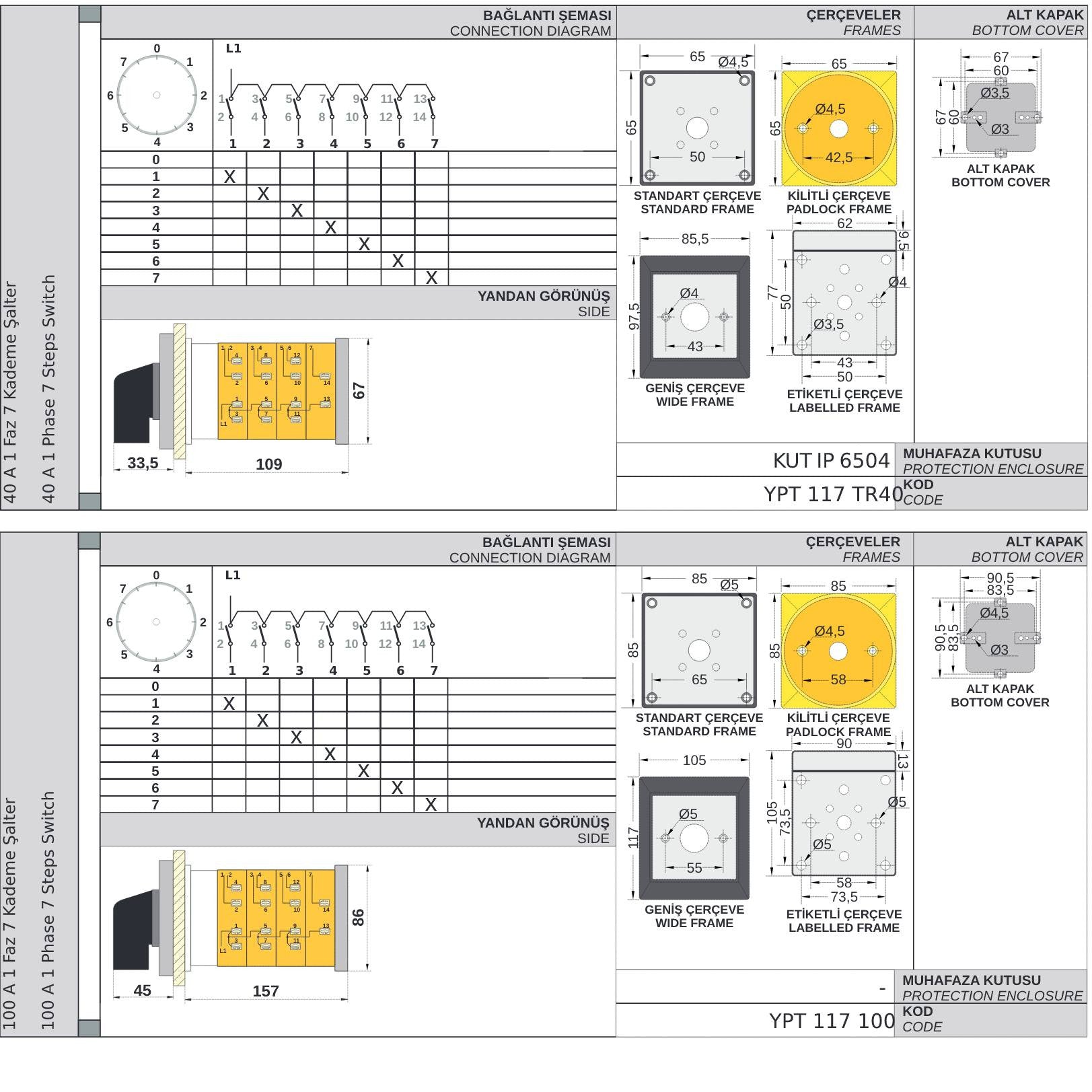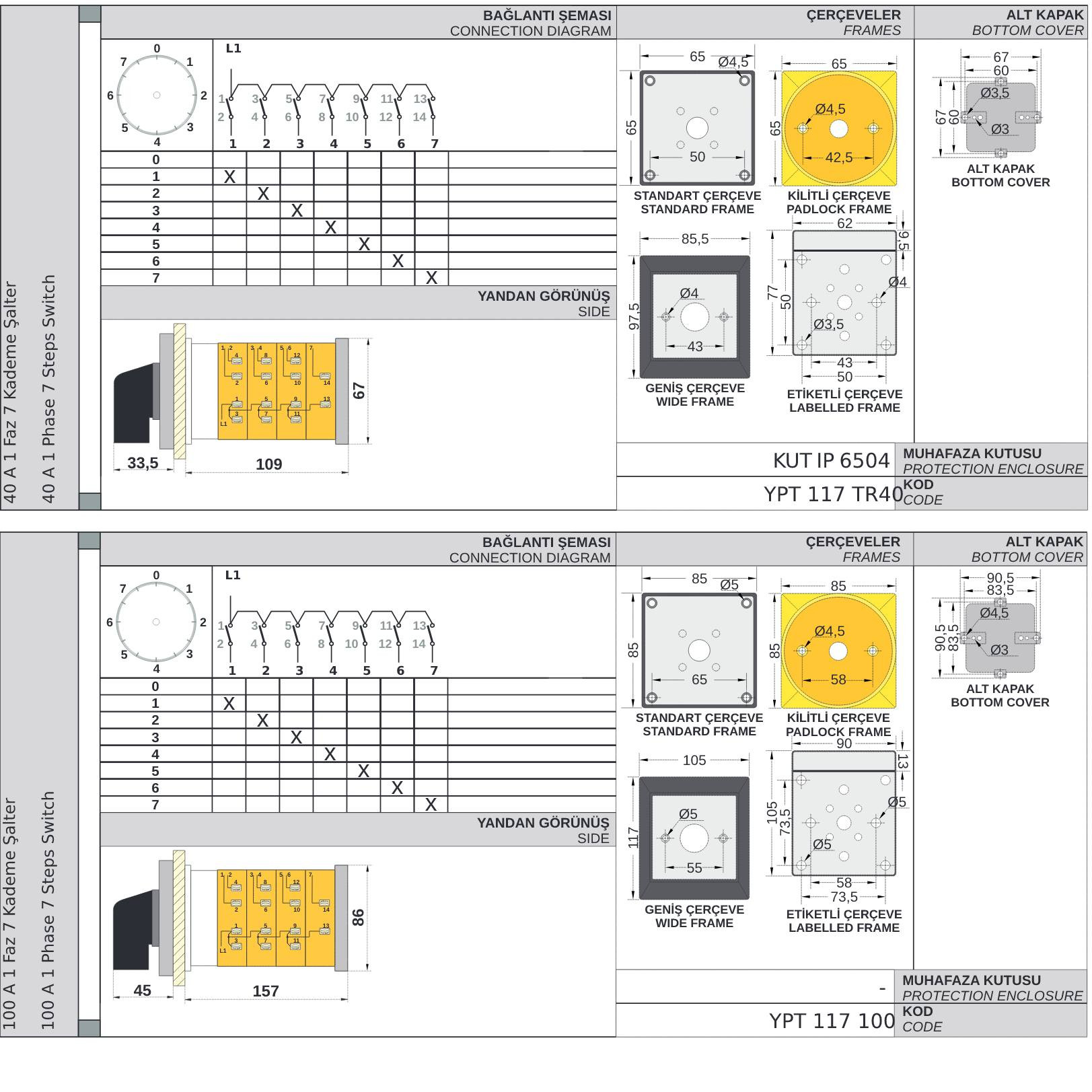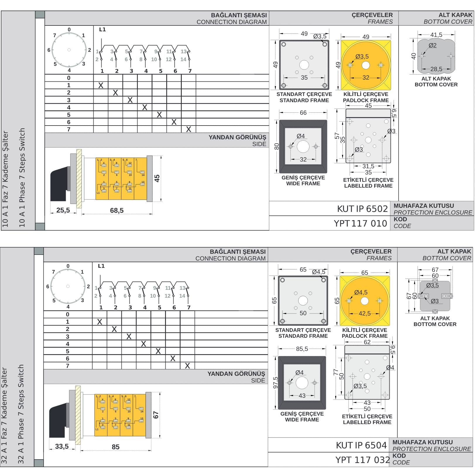 Interruptor de passo (degrau) 0-1-2-3-4-5-6-7, interrutor rotativo, 1 pólo, 10-160A, YPT117 fabricante OPAŞ (Turquia)