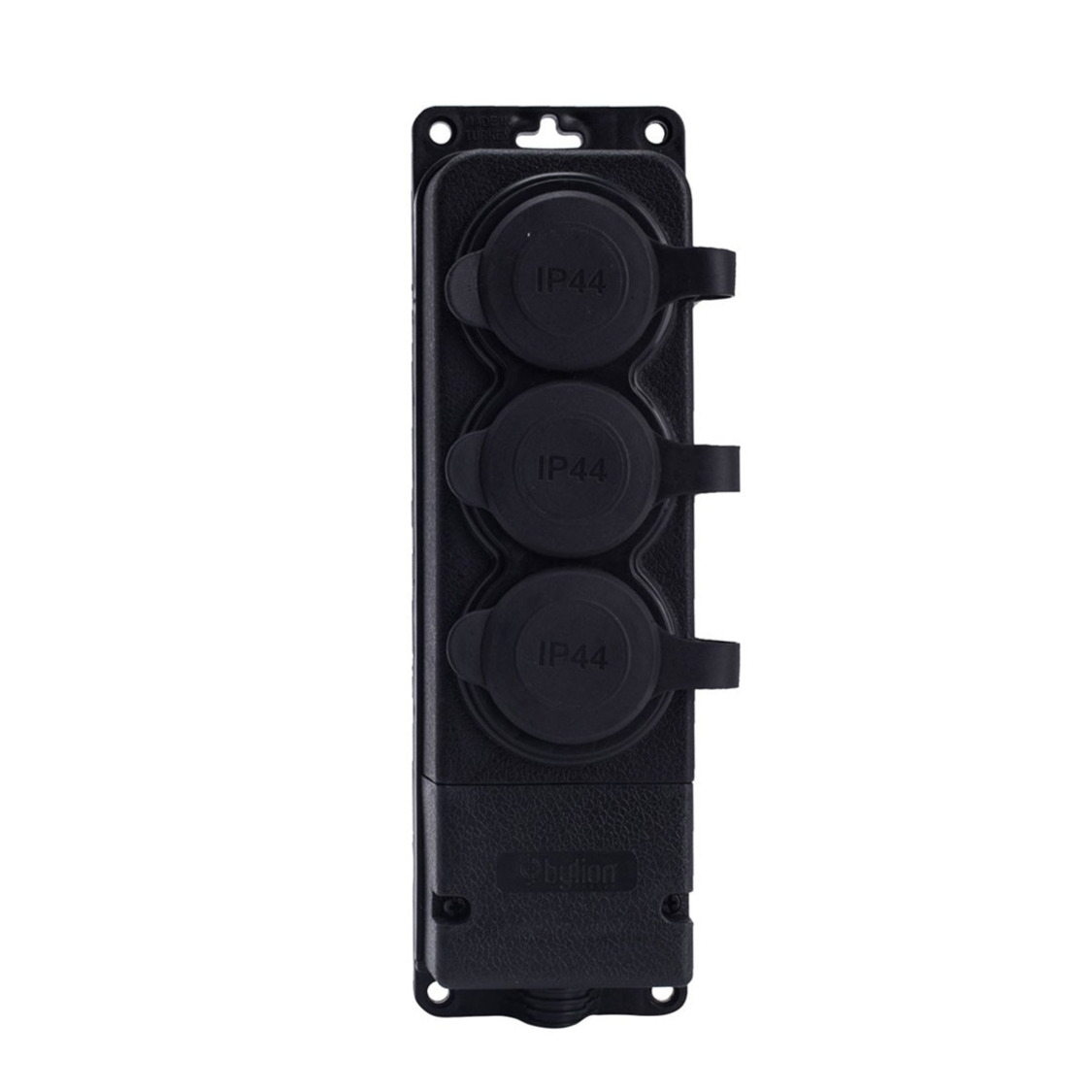 Tomada tripla hermética 3 x "borracha" preta de alta qualidade com proteção IP44(com aba) com norma de ligação à terra SCHUKO, 16 amperes 250 volts, fabricante Bylion